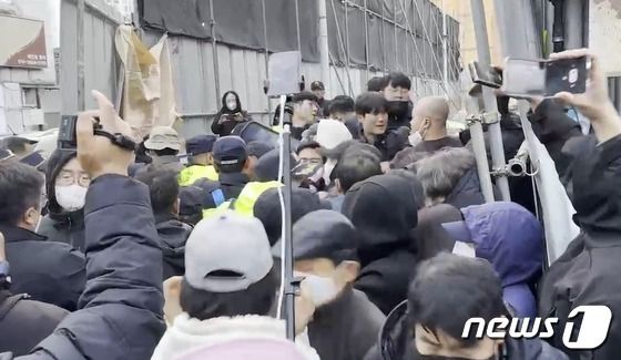 2023년 10월 28일 강원 원주 아카데미극장 철거공사 현장 주변에 경찰과 집회 관계자 등이 뒤엉켜 있는 모습. (독자 제공. 재판매 및 DB금지) 2023.10.28/뉴스1 신관호 기자