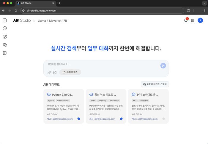 에어 스튜디오는 아마존웹서비스(AWS) 베드록, 구글클라우드플랫폼(GCP) 버텍스 AI, 에저 오픈AI 등 현재 서비스되고 있는 주요 AI 서비스는 물론, 향후 등장할 신기술을 손쉽게 통합·교체할 수 있다. 또 권한 제어, 데이터 보안, 사용 정책 등을 단일 콘솔에서 통합 관리할 수도 있도록 했다.