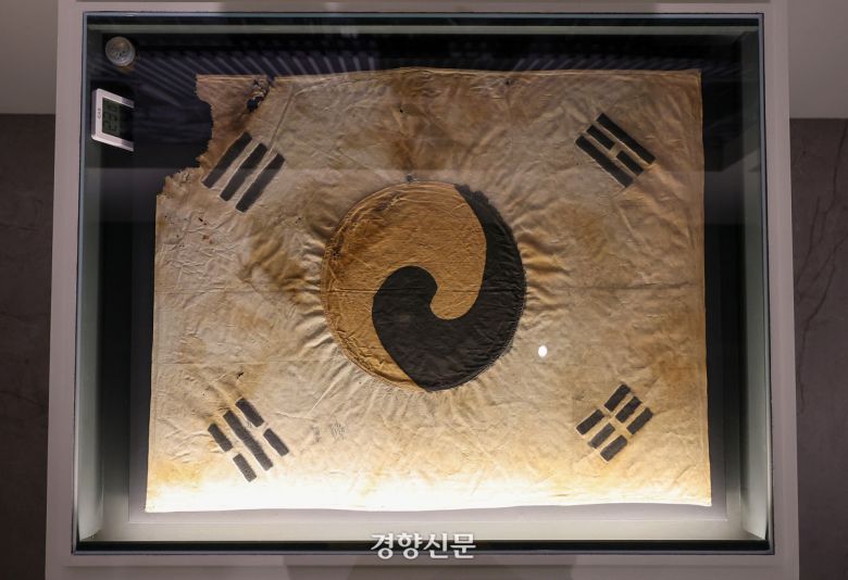 11일 서울 중구 덕수궁 돈덕전에서 열리는 ‘빛을 담은 항일유산’ 특별전에 한국광복군 서명문 태극기가 전시되어 있다. 권도현 기자 |