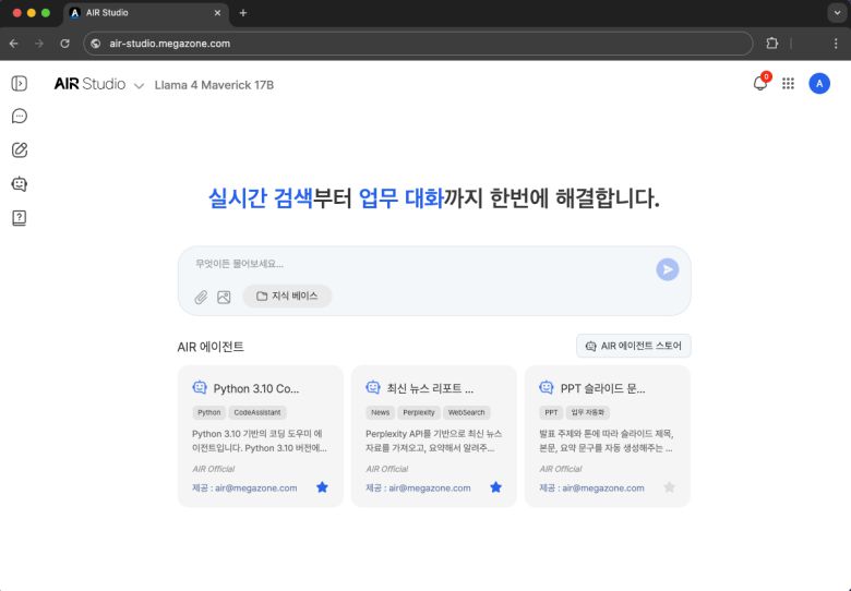 메가존클라우드에 따르면 AIR 스튜디오는 최신 AI 기술과 모델을 손쉽게 적용 및 교체할 수 있는 미래 지향적 아키텍처를 기반으로, 챗봇·에이전트·문서 자동화·검색 기반 질의응답 등 다양한 기능을 단일 환경에서 제공하는 AI 서비스 플랫폼이다.