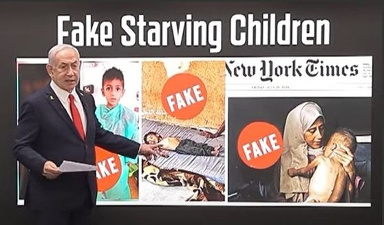 이스라엘 일간 타임스오브이스라엘 등 외신에 따르면, 네타냐후 총리는 10일(현지시간) 기자회견에서 NYT가 하마스의 주장을 사실 확인 없이 받아들였다고 주장했다. 그는 지난달 25일 NYT 1면에 실린 ‘뼈만 앙상한 18개월 아기 모하메드 알무타와크’의 사진에 빨간색 ‘가짜’ 표시를 덧붙여 제시했다. 해당 보도에서 어머니는 “건강하게 태어난 아기가 최근 심각한 영양실조로 진단됐다”고 전했다.