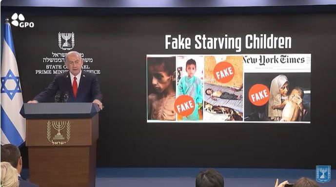 네타냐후 이스라엘 총리가 기자회견에서 뉴욕타임스가 보도한 '가자지구 기아' 사진을 가짜라고 주장하고 있다. (이스라엘 총리실 유튜브) |
