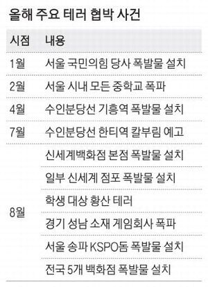 이달 들어 온라인에 게시되는 테러 글도 시민들을 불안하게 하고 있다. 지난 5일엔 서울 중구 신세계백화점 명동 본점을 폭파하겠다는 글이 온라인에 올라와 당시 백화점에 있던 시민 4000명이 대피하는 일이 벌어졌다.