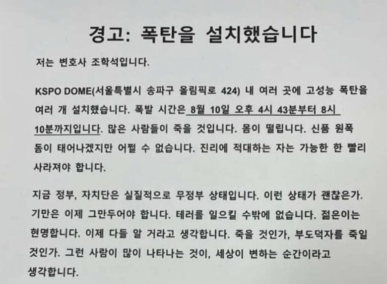 최근 폭발물이 설치됐다는 협박 글에 경찰력 낭비와 경제적 피해가 잇따르는 가운데 경찰이 11일 허위신고를 일삼는 세력을 특정하고 수사에 나섰다. 경찰은 전날 서울 올림픽공원 KSPO돔(체조경기장)을 폭파하겠다며 2000여명을 대피시킨 협박 글과 2년 전부터 40여 차례 반복된 일본 변호사 명의를 도용한 협박 글에서 형식 등 공통점을 특정해 수사 중이다. 다만 모두 해외 주소가 사용돼 범인 특정에 어려움을 겪고 있다.