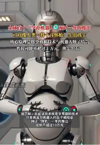 중국 과학기술 매체 콰이커지에 따르면 로봇회사 창업자 장치펑 싱가포르 난양이공대 박사는 지난 8일 인터뷰를 통해 "임신 로봇은 휴머노이드 형태로, 복부에 인공자궁을 장착해 10개월 간 태아를 품고 출산할 수 있다"고 설명했습니다.