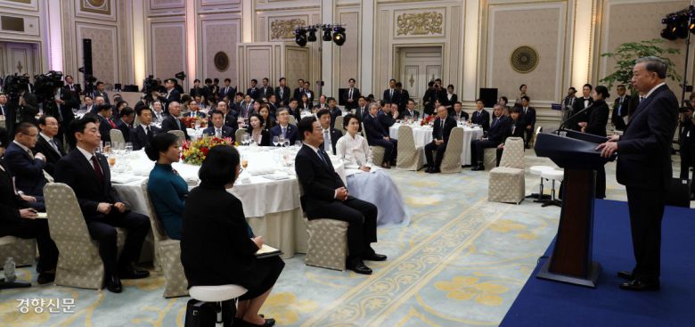 청와대서 만찬 또 럼 베트남 공산당 서기장이 11일 청와대 영빈관에서 열린 국빈 방한 기념만찬에서 이재명 대통령의 환영사에 답사를 하고 있다. 김창길 기자 |