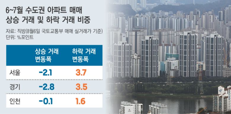 6·27 대출 규제 이후 수도권 아파트 시장에서 이전 실거래가보다 낮은 가격에 매매되는 ‘하락 거래’ 비중이 커졌다. 고강도 대출 규제 영향으로 위축된 매수 심리가 반영된 결과로 보인다.