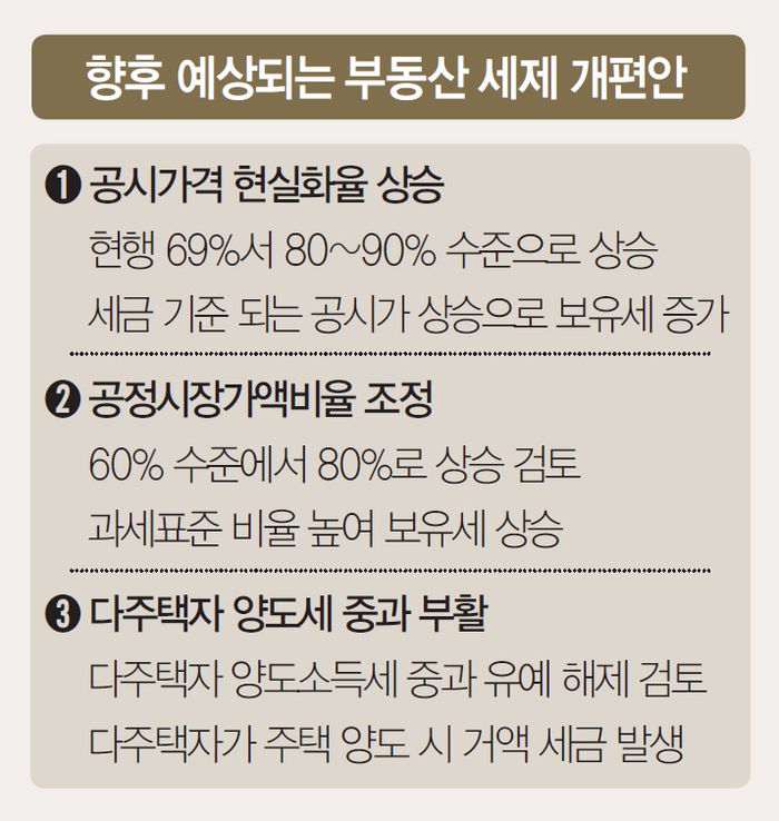 시장에선 공시가격, 공정가액비율 조정을 넘어선 ‘부동산세 직접 개편’ 카드가 나올 것이란 관측도 나온다. 다주택자를 겨냥해 세금을 강화해야 한다는 주장이 여권 일각에서 계속 나오는 탓이다. 김상욱 더불어민주당 의원은 최근 한 인터뷰에서 “세제 개편에 집중해야 될 부분은 부동산 세제가 아닐까 생각하고 있다”고 밝힌 바 있다. 중산층이나 1주택자 대상 세금을 그대로 두더라도 민주당 정책 기조상 다주택자, 고액주택 보유자 세금에 메스를 댈 가능성이 높다.