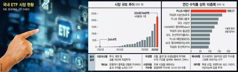 지난 6월 초 ETF의 순자산총액이 200조원을 돌파했다. 코스피 시가총액의 8.4%에 달하는 규모다. 2002년 국내 도입 이후 23년 만이었다. ETF는 코스피200 등 특정 지수의 수익률을 따르는 인덱스 펀드다. 투자자가 증권사 앱 등을 통해 주식처럼 실시간 거래할 수 있다는 점에서 기존 펀드와 차이가 있다. 특히 최근엔 단순히 지수를 따르는 상품뿐 아니라 하락장에 수익을 내는 인버스나 매달 수익금을 받을 수 있는 배당형 등 다양한 상품이 출시되고 있다.
