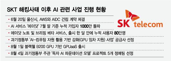 서비스 부문에서도 성과가 이어지고 있다. AI 서비스 '에이닷'은 7월 말 기준 누적 가입자 1000만명을 돌파했고, 최근 선보인 '에이닷 노트'와 '브리핑' 베타 서비스는 출시 한 달 만에 누적 사용자 80만명을 기록했다. 지난달 31일에는 과학기술정보통신부의 'AI-컴퓨팅 자원 활용 기반 강화(GPU 임차 지원) 사업' 공급사로 선정됐다. 이를 위해 가산 AIDC에 엔비디아 최신 AI 칩 '블랙웰 B200' 1000장 이상을 단일 클러스터로 구성해 국내 최대 규모·최고 성능의 GPUaaS(서비스형 GPU)를 이달 1일 출시했다.