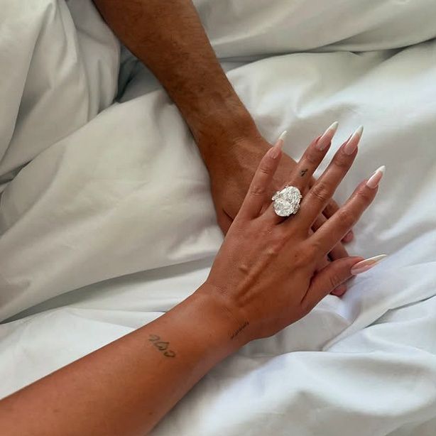 함께 공개한 사진을 보면 로드리게스는 약지에 커다란 다이아몬드 반지를 낀 왼손을 호날두로 추정되는 남성 손 위에 얹고 있다.