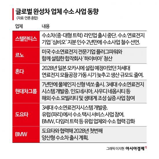 다국적 완성차 기업 스텔란티스는 지난달 수소 사업 중단을 선언했다. 스텔란티스는 푸조, 피아트, 크라이슬러, 지프, 마세라티 등 14개 브랜드를 보유한 거대 자동차 그룹으로, 하반기 프랑스와 폴란드 공장에서 수소연료전지(수소차) 중·대형 밴을 생산할 예정이었다. 회사는 신차 출시를 취소하고 개발 인력은 다른 프로젝트에 투입기로 했다.