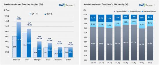 업체별로 중국 샨샨(137.4킬로톤)과 BTR(110.5킬로톤)이 각각 1위와 2위를 차지하며 글로벌 음극재 시장을 견인했다. 이 기업들은 CATL, BYD, LG에너지솔루션 등 주요 배터리 제조사에 음극재를 공급하며 안정적인 고객 기반을 갖췄다.