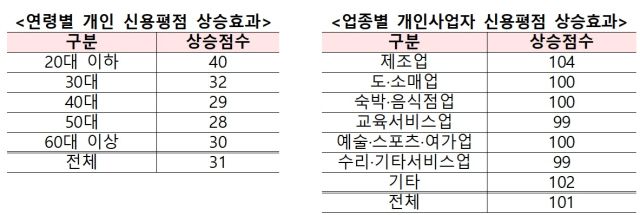 업종별로는 제조업이 104점, 도·소매업, 숙박·음식점업 등이 100점, 수리 등 서비스업이 99점 등 신용평점 상승해 전 업종에 걸쳐 유사한 신용회복 혜택이 기대됐다.