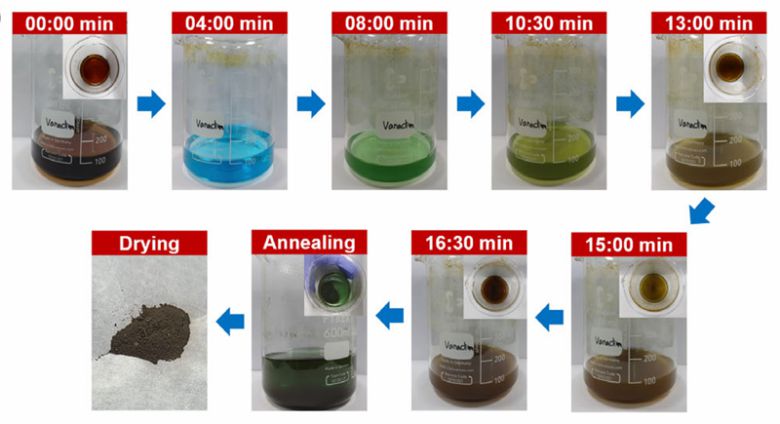한국에너지공과대학교 서동한 교수팀이 개발한 플라즈마 보조 수열 합성법으로 바나듐 산화물 양극재가 합성되는 과정. 0분부터 16분 30초까지 용액 색상이 청색에서 녹색과 황록색을 거쳐 점차 짙은 갈색으로 변하며 고체 입자가 형성된다. 이후 어닐링과 건조 과정을 거쳐 최종 고성능 양극재 분말이 완성된다. 서동한 교수 제공 |