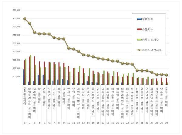 골프웨어 브랜드평판 1위를 기록한 PXG 골프웨어 브랜드는 참여지수 187,754 소통지수 297,459 커뮤니티지수 314,407이 되면서 브랜드평판지수 799,620으로 분석됐다. 지난 7월 브랜드평판지수 1,275,156과 비교해보면 37.29% 하락했다.