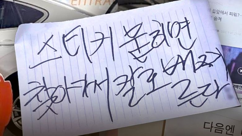 지난 7일 광주 서구 화정동의 한 아파트 단지 지상에 주차된 차 앞 유리에는 '스티커 붙이면 찾아가서 칼로 배 찌른다'고 적힌 메모가 붙어있었습니다.