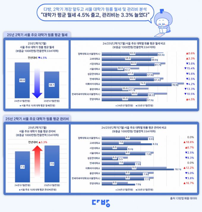 다방 관계자는 "최근 서울 주요 대학가 원룸의 평균 월세는 하락했지만, 평균 관리비는 상승한 것을 확인할 수 있었다"라며 "대학가에 주로 거주하는 청년층과 1인 가구는 월세뿐만 아니라 관리비도 고정 지출인 만큼 월세가 줄었더라도 실질적인 주거 부담은 여전히 클 것으로 보인다"라고 말했다.