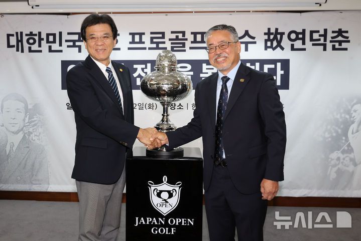 [서울=뉴시스] 권창회 기자 = 12일 오전 서울 중구 프레스센터에서 열린 대한민국 1호 프로골프 선수 故연덕춘, 역사와 전설을 복원하다 행사에서 김원섭(오른쪽) KPGA 회장과 야마나카 히로시 일본골프협회 전무가 故연덕춘 고문의 일본오픈 복원 트로피를 공개한 뒤 기념촬영을 하고 있다. 이번 행사는 고인이 일제강점기인 1941년 일본프로골프 최고 권위 대회인 일본오픈에서 우승할 당시 일본인 '노부하라 도쿠하루(延原德春)’로 기록된 우승자 이름과 국적이 ‘연덕춘’으로 고쳐졌다. 2025.08.12. kch0523@newsis.com