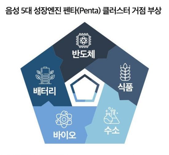 '펜타 클러스터'는 음성군의 미래를 책임질 5개의 핵심 성장 동력을 의미한다. ▲배터리 ▲반도체 ▲바이오 ▲수소 ▲식품이다. 단순한 기업 유치를 넘어 각 산업들이 유기적으로 연계되는 '산업 생태계'를 조성하는 것이 핵심이다. 특히 특정 산업이 지역에서 주도적 역할을 하는 '앵커기업'으로 자리매김하고 있어 음성의 부가가치를 높이고 있다.