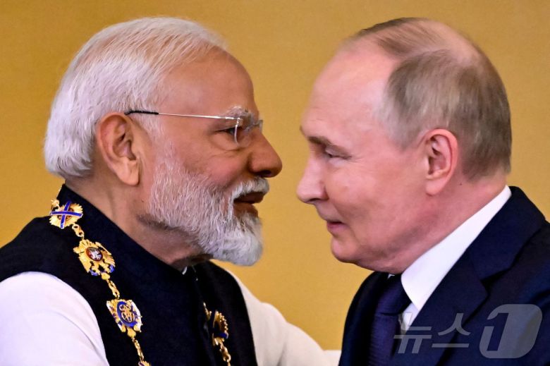 블라디미르 푸틴 러시아 대통령(오른쪽)과 나렌드라 모디 인도 총리. 2024.7.9 ⓒ AFP=뉴스1 ⓒ News1 강민경 기자 |