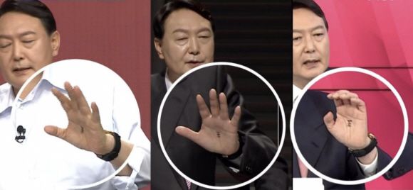 윤석열 전 대통령이 지난 대선 후보 토론회 당시 손바닥에 ‘王’자를 적고 나온 모습. 채널A·MBC·MBN 캡처
