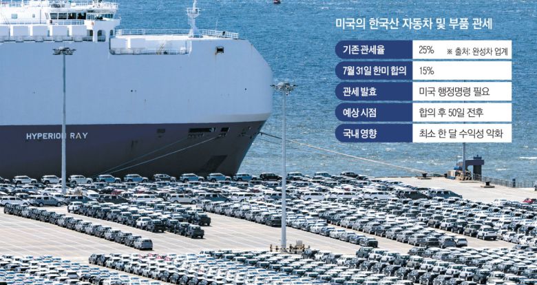 국내 완성차 업계가 한미 양국이 지난달 합의한 자동차와 부품 관세 15% 적용 시점이 늦어지면서 촉각을 곤두세우고 있다. 수출 현장에서는 미국향 물량에 여전히 25% 관세가 적용되면서 수천억 원대의 수익성 악화가 지속될 것으로 전망된다. 완성차 업계에서는 재빠른 관세 인하 적용과 함께 세제 지원 등 정부 차원의 대응이 필요하다고 호소한다.