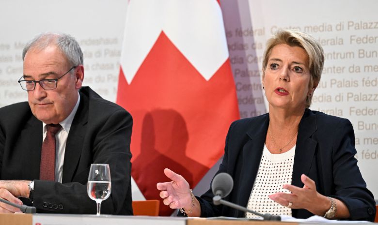 카린 켈러-슈터 스위스 대통령(오른쪽)이 7일(현지시간) 베른에서 미국의 관세와 관련해 가이 파멜린 스위스 경제장관(왼쪽)과 기자회견을 하고 있다./AFP 연합뉴스 |