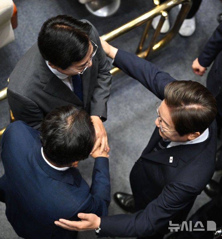 [서울=뉴시스] 국회사진기자단 = 이재명 대통령이 26일 서울 여의도 국회에서 열린 본회의에서 추가경정예산안 시정연설을 마친 뒤 더불어민주당 대표 선거에 출마한 박찬대, 정청래 의원과 인사하고 있다. 2025.06.25. photo@newsis.com |