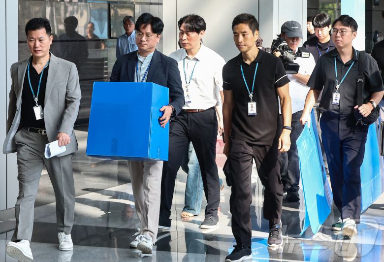 경기남부경찰청과 고용노동부 관계자들이 12일 인천시 연수구 포스코이앤씨 본사 사옥에서 압수품을 담기 위한 박스를 들고 이동하고 있다. 2025.8.12/뉴스1 ⓒ News1 김도우 기자