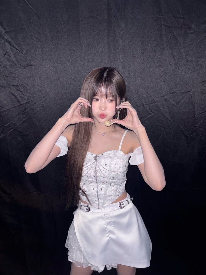 클로즈업된 셀카 속 송하영은 하트 포즈와 함께 미소를 짓고 있다. 깊이 있는 브라운 음영과 속눈썹이 눈매를 또렷하게 잡아주고, 하얀 무대 의상 위 반짝이는 주얼 장식과 네크리스가 포인트가 돼 러블리한 매력을 배가시킨다.