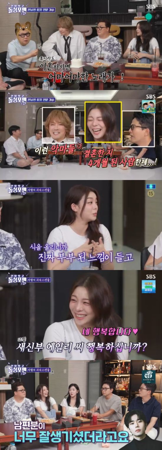 이날 방송에서 탁재훈은 결혼 4개월차인 에일리에게 "노래 열심히 잘 부르다가 갑자기 결혼을 했다. '전남친 퇴치 노래' 전문 아니었냐"면서 "'보여줄게'라는 노래가 남자친구와 이별 후 다이어트 노래로 엄청 인기가 많았다더라"고 했다.