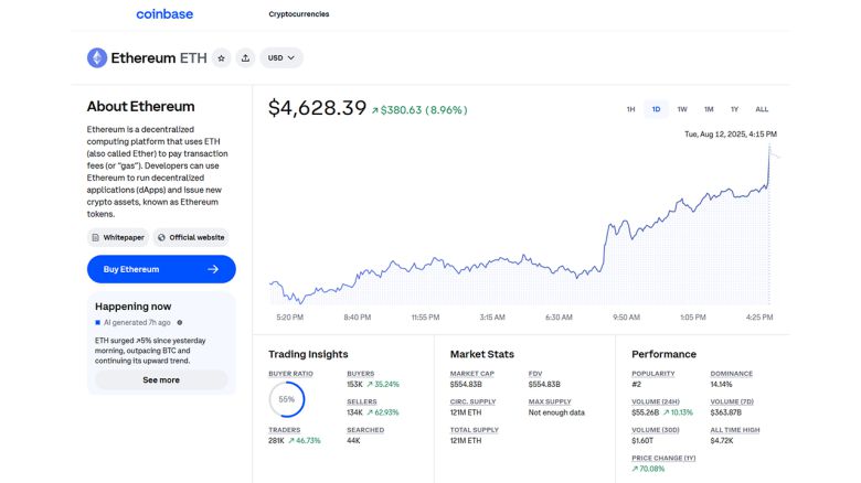 미국 가상화폐 거래소인 코인 베이스에서 미국 동부 시각 오후 4시 15분 기준 이더리움의 개당 가격은 24시간 전보다 8.96% 오른 4,628.39달러를 나타냈습니다.