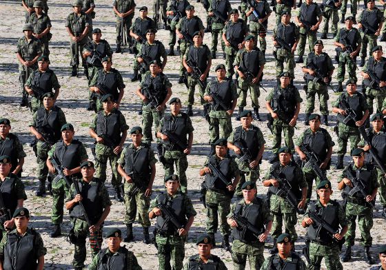 지난 2009년 7월 20일(현지시간) 멕시코 미초아칸주 모리엘라에서 병영에 집결하고 있는 마약 단속 작전 중 군인들. AFP=연합뉴스 |