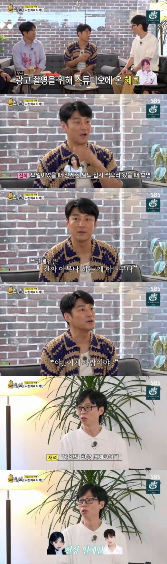 지진희는 "당시에 제가 일하던 스튜디오에 중학생이었던 송혜교 씨가 광고 촬영을 위해 왔었다. 정말 예쁘더라. '연예인은 아무나 하는 거 아니구나'라는 생각이 들었다. 그리고 전지현 씨도 잡지 촬영 때문에 왔는데 '이게 사람이야?' 싶었다"고 충격적이었던 송혜교와 전지현의 실물을 언급했다.