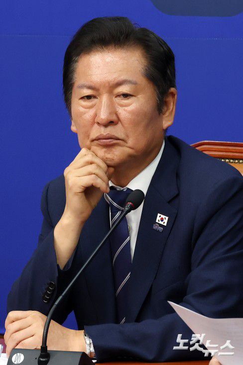더불어민주당 정청래 대표가 13일 서울 여의도 국회에서 열린 최고위원회의에서 생각에 잠겨있다.