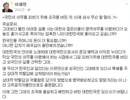 이들은 "최근 저희 성명문 발표 이후, 10년 전 이재명 대통령의 페이스북 발언이 다시 주목받고 있다"라며 과거 이 대통령이 유승준에 대해 "국방의 의무를 피하기 위해 조국을 버린 자"라고 말했던 부분을 언급했다.