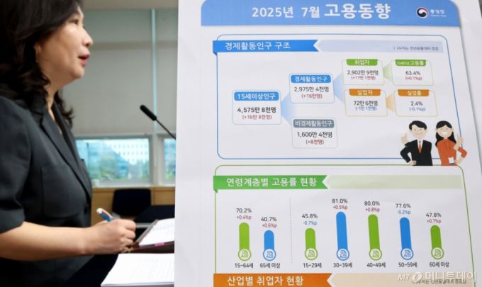 지난달 15세 이상 고용률은 전년동월 대비 0.1%p 상승한 63.4%다. OECD(경제협력개발기구) 비교 기준인 15~64세 고용률은 전년동월 대비 0.4%p 오른 70.2%로 집계됐다. 고용률은 1999년 관련 통계 작성 이후 7월 기준 가장 높다.