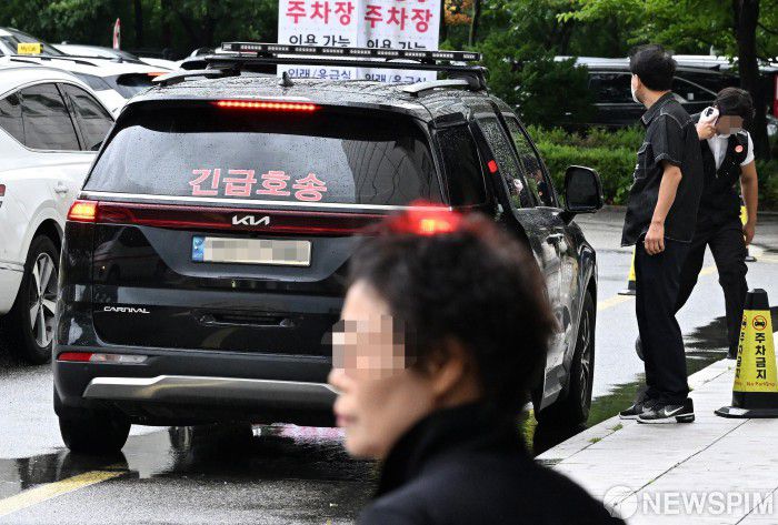 [안양=뉴스핌] 김학선 기자 = 서울구치소에 수감 중인 윤석열 전 대통령이 13일 병원에서 안과 진료를 받은 것으로 확인됐다. 윤 전 대통령은 이날 오전 경기도 안양시의 한 대형병원을 방문해 진료를 받았다. 사진은 이날 병원 앞에 주차된 법무부 교정본부 호송차량. 2025.08.13 yooksa@newspim.com