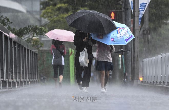 서울 일부 지역에 호우 특보가 발효된 13일 서울 마포구 불광천 인근에서 우산을 쓴 시민들이 발걸음을 재촉하고 있다. 2025.8.13 이지훈 기자 |