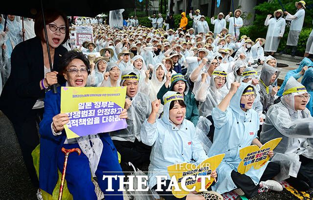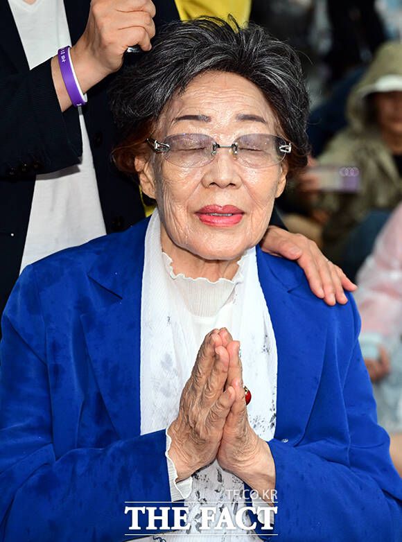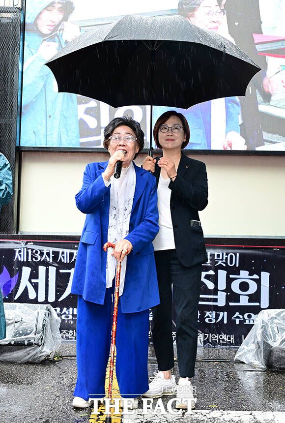 [더팩트ㅣ임영무 기자] 위안부 피해자이자 여성인권 활동가 이용수 할머니가 13일 오후 서울 종로구 일본대사관 앞 평화로에서 열린 제1713차 수요시위에 참석해 구호를 외치고 있다.