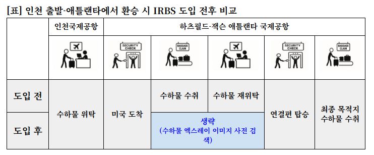 인천 출발-애틀랜타 환승 시 IRBS 도입 전후 비교 모습. |