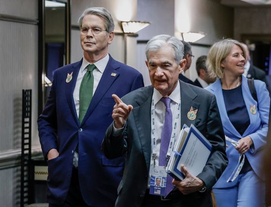 스콧 베센트 미국 재무장관(왼쪽)과 제롬 파월 미국 연방준비제도(Fed) 의장. 지난 5월 캐나다 앨버타주 밴프에서 열린 G7 재무장관 회의에서 함께 이동하는 모습. AP=연합뉴스 |