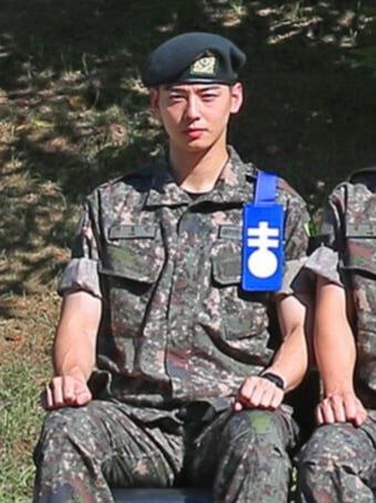 사진 속 차은우는 두 손을 무릎 위에 가지런히 올린 채 정면을 바라보고 있다. 중대장 훈련병 완장을 찬 모습이다.