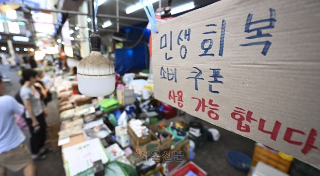민생회복 소비쿠폰 안내문 - 서울의 한 재래시장에 지난 7일 민생회복 소비쿠폰 사용 가능을 알리는 안내문이 붙어 있다. 이지훈 기자 |