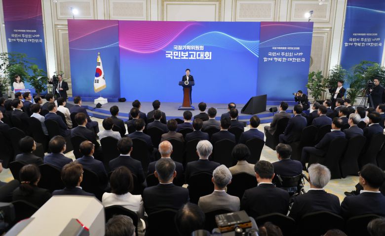 대통령 직속 국정기획위원회는 이날 오후 청와대 영빈관에서 국민보고대회를 열고 이재명 정부의 국정 청사진인 국정운영 5개년 계획을 발표했다. 새 정부 국정 운영의 지향점이 될 국가 비전은 ‘국민이 주인인 나라, 함께 행복한 대한민국’이다. 국정기획위는 국민이 하나 되는 정치, 세계를 이끄는 혁신경제, 모두가 잘사는 균형 성장, 기본이 튼튼한 사회, 국익 중심의 외교·안보라는 5대 국정 목표 아래 23대 추진전략과 123대 국정과제를 제시했다. 123개 국정과제의 첫머리로는 ‘진짜 대한민국을 위한 헌법 개정’을 내세웠다.