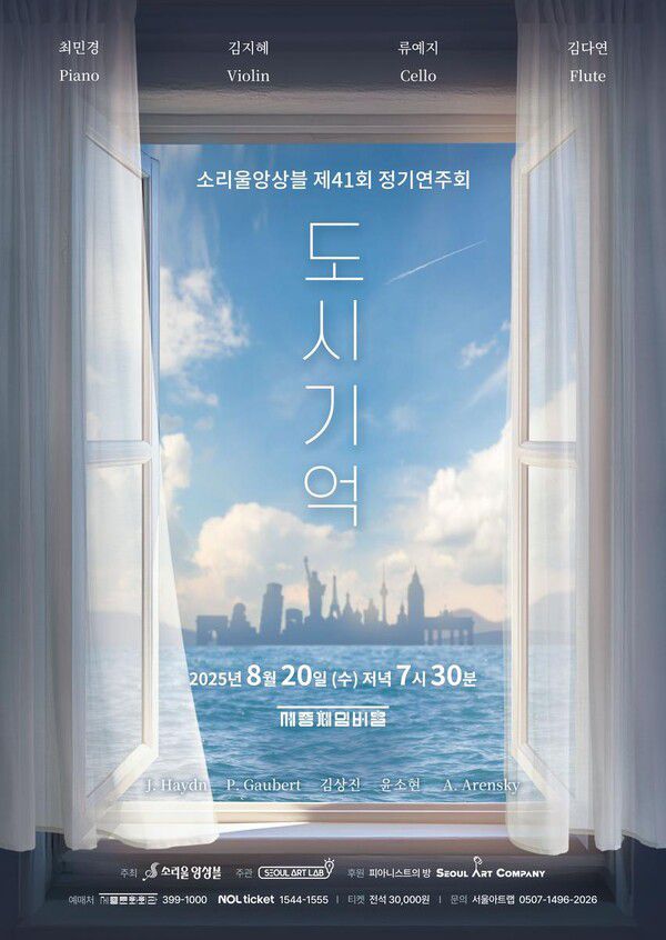'도시기억'이라는 테마로 열리는 이번 무대에서는 피아니스트 최민경, 바이올리니스트 김지혜, 첼리스트 류예지, 플루티스트 김다연이 연주자로 나서 다채롭고 깊이 있는 연주를 선보일 계획이다.