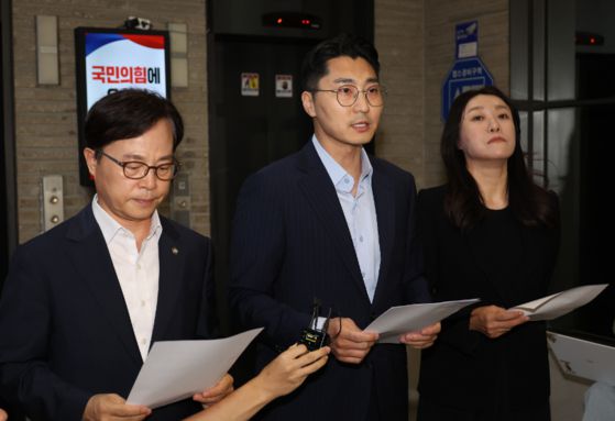 박준태 국민의힘 의원(가운데)이 13일 서울 여의도 국민의힘 당사에서 당사 압수수색과 관련해 성명서를 읽고 있다. 〈사진=연합뉴스〉 |