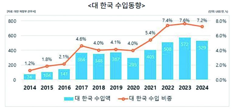 대만의 콘택트렌즈 수입 규모는 2019년 8,900만 달러(한화 1,216억 원)로 정점을 찍었고 2020년부터는 7,000만 달러대를 유지하고 있다. 2024년 수입은 7,335만 달러로 전년 대비 2.3% 감소했다.