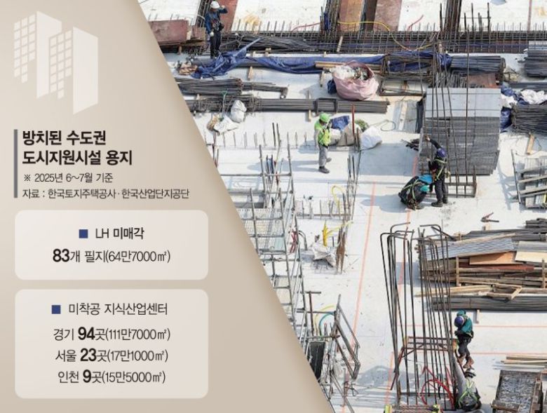 이 뿐만이 아니다. 현재 서울 등 수도권에는 인허가를 받고도 착공 못한 지식산업센터(자족용지)가 택지지구와 도심 곳곳에 위치해 있다. 한국산업단지공단에 따르면 7월말 기준으로 경기 94곳 111만7000㎡, 서울 23곳 17만1000㎡, 인천 9곳 15만5000㎡ 등 144만3000㎡의 땅이 방치 상태다.